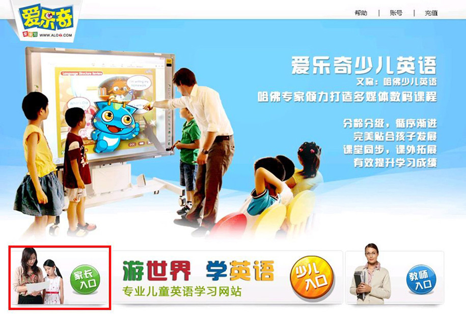 登录爱乐奇官网首页(WWW.ALO7.COM),点击页面左侧“家长入口“,进入家长中心