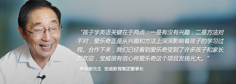 董事长单崇敏先生在教育方面一直有着自己独到的看法和远见。单先生认为,在宝威的战略布局中,拥抱互联网是历史的必然。从这个方面来讲,爱乐奇是先走了一步。他同时表示宝威很有信心和爱乐奇的合作项目将来一定会在宝威发扬光大。爱乐奇为宝威和社会提供这样好的产品,他对爱乐奇的员工和 表达了深深的祝愿和感激之情。